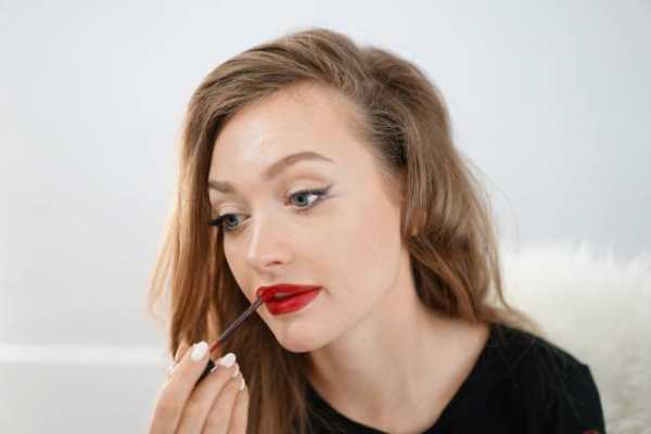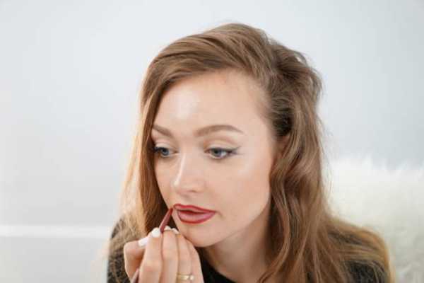 Обведите контур губ насыщенным темно-красным карандашом, а сердцевинку заполните красной помадой. Если это необходимо, подравняйте контур корректором.