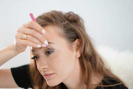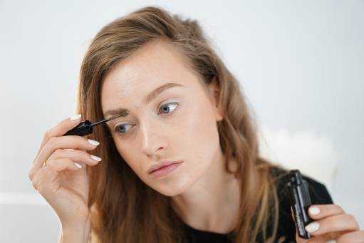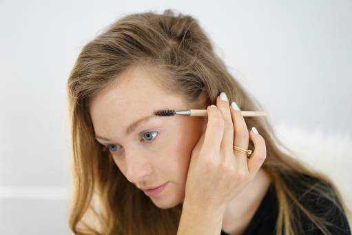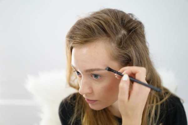 Расчешите брови и серо-коричневым оттенком дорисуйте недостающие волоски, закрепите эффект оттеночным гелем.