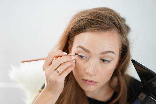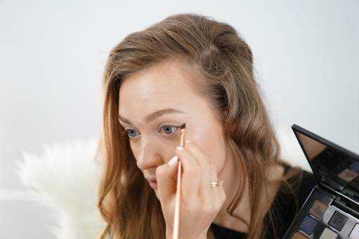 Светло-бежевым оттенком теней заполните пространство над складкой века и под ней.