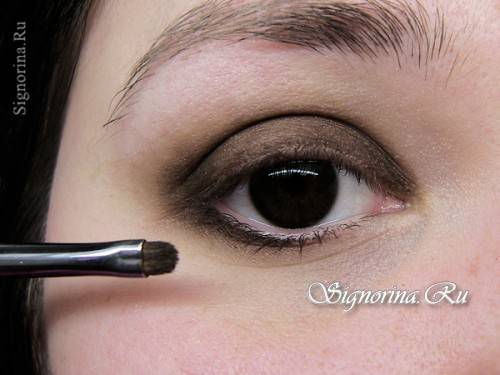 9) Внутреннее нижнее веко затемняем коричневым цветом. Если нет мягкого карандаша, можно заменить его тенями соответствующего оттенка, однако, стоит помнить, что они быстрее сотрутся и потеряют цвет.