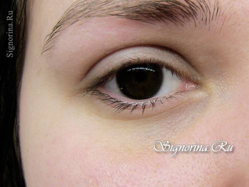 7) Светлой тенью забеливаем внутренний уголок и непрокрашенную часть нижнего века. В качестве заключительного штриха добавим белый цвет под бровь.