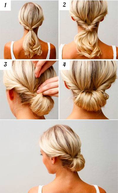 Соседствующие пряди скручивают в жгут на правую сторону, осуществляют слияние и делают еще один жгут, скручивая его в левый бок. Оформленные в жгут волосы продевают под резинкой хвостика, расположенного в центровой части. Аналогично поступают и с оставшимися прядями. После окончания процесса, из хвостика выделяют прядь волос и располагают ее в промежутке среднего и указательного пальцев. Кончик петли, которая при этом образовалась, продевают под резинку и выравнивают ее долготу. То же самое в круговую проделывают с оставшимися волосами.