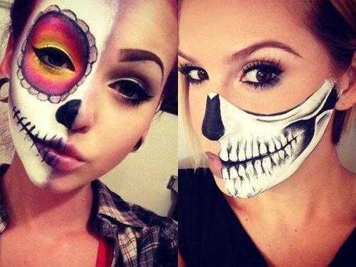 Оригинальный макияж на самый страшный день в году можно выполнить самостоятельно, пользуясь косметическими средствами или же аква гримом. Ниже приведены варианты, которые сделают девушку звездой любой вечеринки.