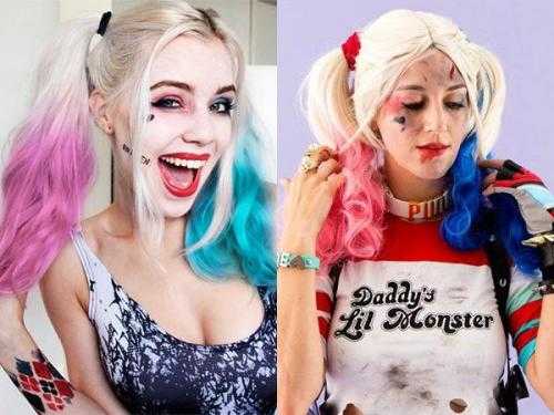 Суперзлодейка Харли Квинн также попала в топовые персонажи для Хэллоуина. Вариант исключительно для блондинок. Для макияжа используйте розовые и голубые тени, черным карандашом нарисуйте пикантное сердечко и тату на лице. Для губ выбирайте сочные, яркие оттенки красного.
