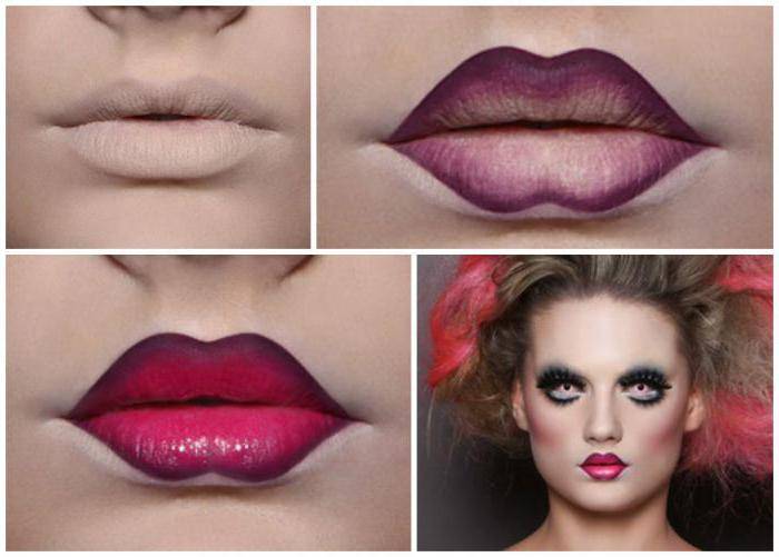 Губы можно накрасить любой яркой помадой от розовой до черной. Желательно придать губам форму «бантика», сделав их более объемными и короткими. Для этого губы покрывают тональной основой, а затем рисуют новый контур, который и закрашивают помадой.