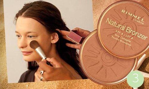 Отправляясь на пляж лишь единицы красавиц хотят демонстрировать бледность своей кожи. Замаскировать бледность и придать вашему личику и телу легкий оттенок загара поможет бронзер. Бронзатор нужно наносить над скулами, на краюшек лба, где проходит линия роста волос, на височные зоны, подбородок и капельку под линией бровей. Также бронзером можно пройтись по таким зонам, как декольте, живот и ноги. Такое легкое припудривание помогает не только стать загорелой, но и даже немного постройнеть.