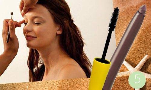 Если вы не хотите использовать тушь в своем пляжном мейк апе, но при этом хотите выглядеть выразительно, подведите глаза коричневым карандашом или же воспользуйтесь водостойкими кремовыми тенями из золотистой, кофейной или серой гаммы.