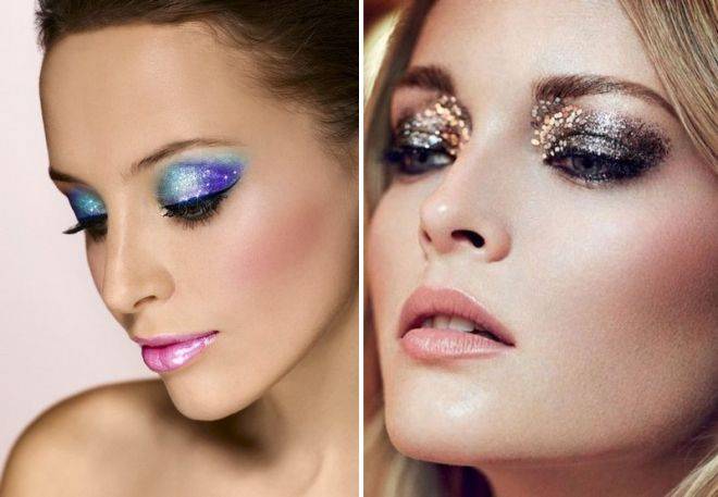 - Металлик – предполагает наличие блесток или пайеток, которые смотрятся невероятно эффектно. В сочетании с тенями, которые соответствуют определенному цвету глаз, они помогут буквально блистать на празднике или вечеринке.