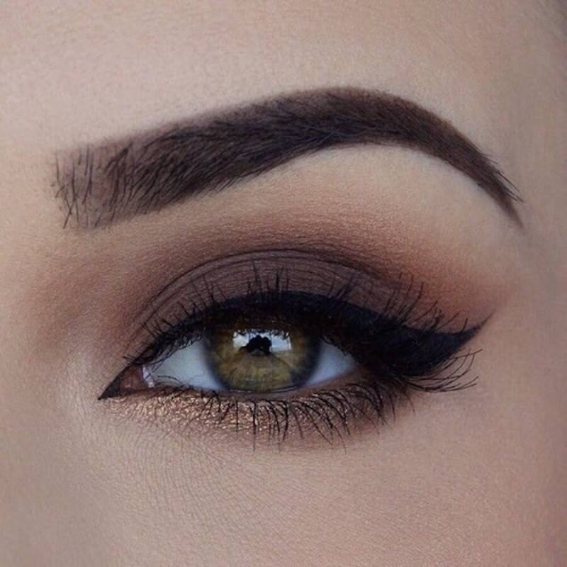 Существует множество цветовых комбинаций для создания макияжа в коричневых тонах. Благодаря этому, его используют девушки с любым цветом глаз, создавая мейкап, который им более всего подходит. Ниже представлен вариант, в котором коричневые матовые тени сочетаются с небольшим блеском.