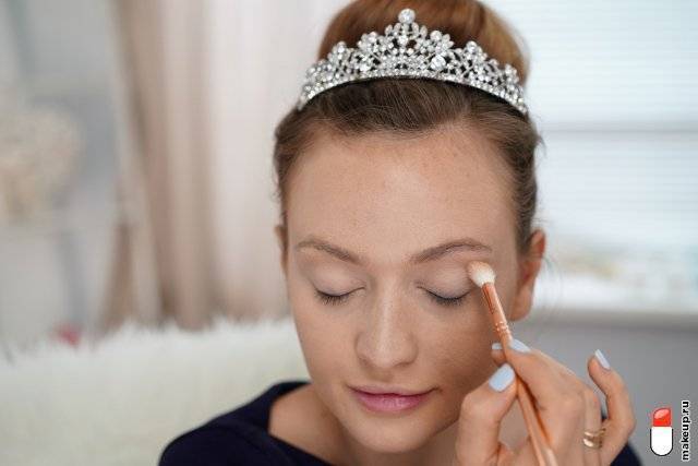 To achieve an open look, apply skin-tone shadow to the entire upper eyelid. White shadows highlight the corner of the eye and the brow arch. Apply eye shadow to the crease of the eyelid and blend thoroughly. Use taupe eyeshadow like Audrey Hepburn. maybethe use of pale pink or gray shadows. We add the same shade of shadows to a third of the eye on the lower eyelid.