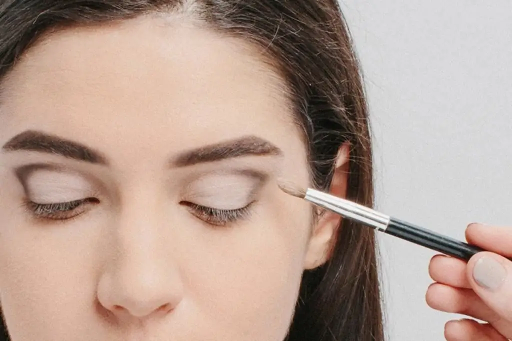 To achieve an open look, apply skin-tone shadow to the entire upper eyelid. White shadows highlight the corner of the eye and the brow arch. Apply eye shadow to the crease of the eyelid and blend thoroughly. Use taupe eyeshadow like Audrey Hepburn. maybethe use of pale pink or gray shadows. We add the same shade of shadows to a third of the eye on the lower eyelid.