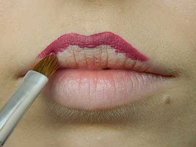 Затем губы тщательно обводятся карандашом, внутренние границы линий растушевывают, наносят помаду выбранного оттенка, с внутренних краев губ салфеткой легонько удаляют часть помады. После этого на свободные участки наносят помаду другого тона, границы растушевывают кисточкой, добиваясь плавного перетекания цветов.