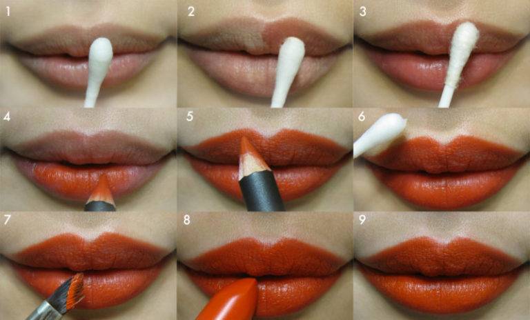 вполне может заменить контурный карандаш. Их также понадобится две или три штуки разных цветов. Далее поэтапно описана инструкция по выполнению омбре мейк апа для губ с помощью красного, розового и белого карандашей.