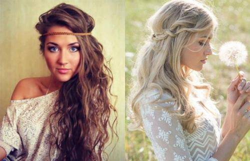 Прически в стиле бохо мало чем отличаются от классики. Распущенные волосы подходят всем. Вариант позволяет скрыть недостатки внешности. В образ впишется прямое или волнистое полотно. В области лба пряди допустимо перехватить диадемой, платком или сделать греческие жгуты. Небрежность внешнего вида идеально поддержит образ.