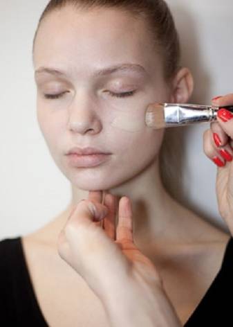 - Специальной круглой щеточкой нанести на всю поверхность лица, кроме области под глазами и над глазами светлое тональное средство.
