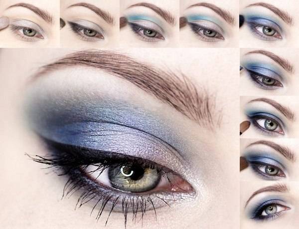 Не стоит перегружать голубые глаза чёрной подводкой и стрелками. Можно невзначай сделать взгляд слишком озлобленным. Оптимальным вариантом будет проработать межресничный контур, чтобы очертить взгляд и прибавить густоты ресницам. А уже дальше мейкап делать с помощью палетки теней.