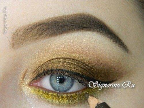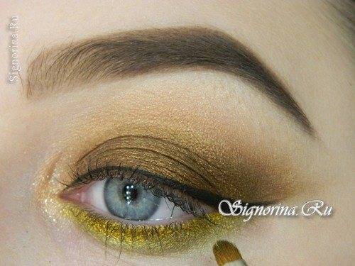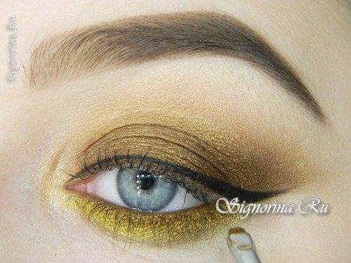 9) Ярко-золотистым оттенком прокрашиваем всё нижнее веко. Не забываем стушевать цвета во внутреннем уголке и очень аккуратно выполнить переход под нижней границей чёрной стрелки, где тушёвка пойдёт на уменьшение.