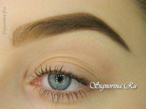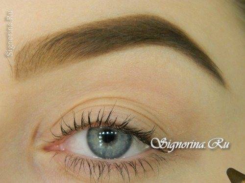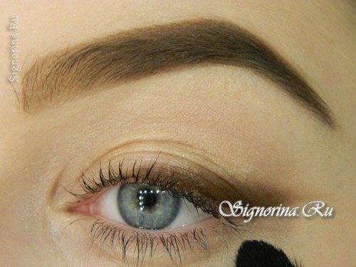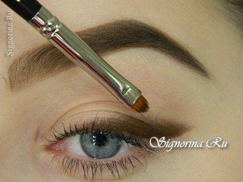 7) Складку между подвижным и неподвижным веком заполняем натуральным бежевым оттенком теней. Этот цвет будет служить в качестве подложки для основного бронзового оттенка. Как раз им покрываем всю карандашную стрелку, затем всё подвижное веко и пушистой кистью тушуем этот цвет на бежевый. Как видите, получается широкая растушёванная стрелка.