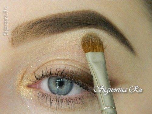 5) Во внутренний уголок наносим светло-золотистый оттенок теней. Лучше всего, если он будет содержать мелкую слюду для более праздничного сияния. Эти тени перламутровые и хорошо будут крепиться к подготовленной заранее основе из праймера или к кремовой подложке, о которых шла речь в начале мастер-класса.