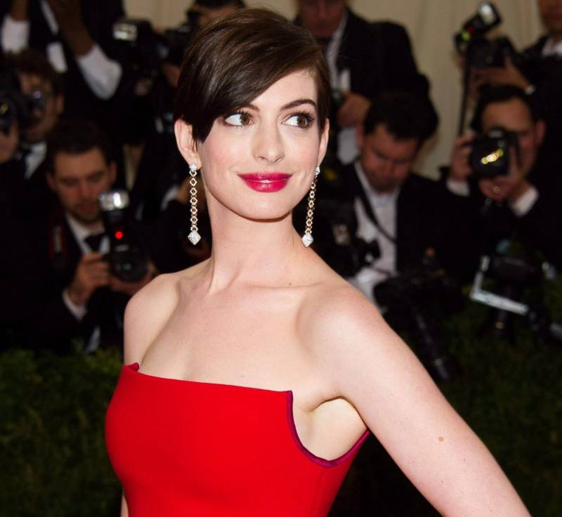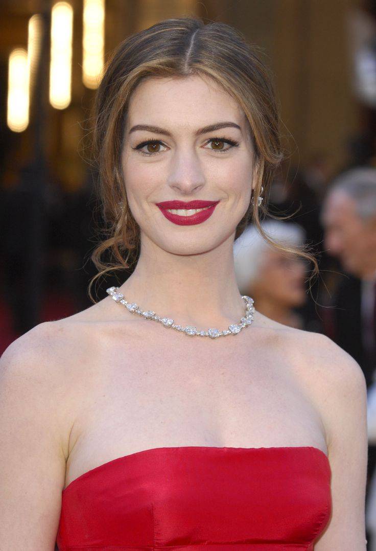 Энн Хэтэуэй выглядит безупречно! У нее идеальная кожа, красиво выделены глаза, а вишенкой на торте является малиновая помада.