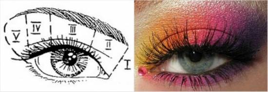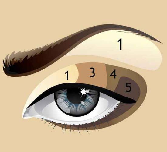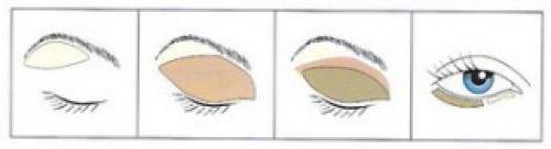 В вертикальной технике макияжа возможно и такое распределение оттенков, когда верхнее веко условно делится на четыре части: в уголок накладываются светлые тени, а дальше оттенки темнее. Самые светлые тени наносят под бровью. Затем их аккуратно растушёвывают.