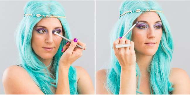 Упор в русалочьем макияже делаем на глаза. Палитра визажа для глаз должна сочетаться с цветом костюма. Гамма должны быть в пределах различных оттенков синего, голубого, бирюзового, изумрудного или темно-зеленого цветов. Обязательно должны присутствовать серебристые оттенки теней. Наносим на все веко вплоть до бровей серебряные тени и тщательно их растушевываем. На нижнюю половину подвижного века следует нанести тот самый выбранный вами оттенок. Его же наносим вдоль роста ресниц на нижнем веке. Хорошо будет подчеркивать русалочьи глаза черная подводка. Не забудьте добавить 2-3 слоя черной туши для ресниц.