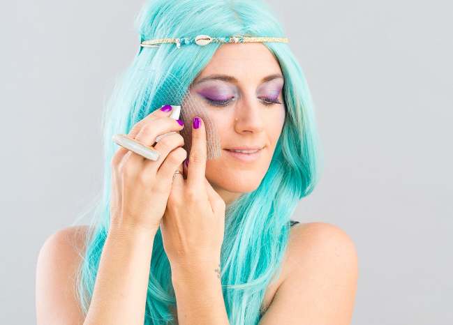 - Теперь макияж русалки требует добавить перламутровых акцентов, чтобы образ соответствовал морской тематике. Удобным и эффективным способом своими руками нанести чешуйки на скулы, виски или лоб (в зависимости от ваших предпочтений), станет использование сетки. Приложите сетку к выбранному участку, обмакните кисть в перламутровые румяна, пудру или тени и прикоснитесь к лицу. Палитру старайтесь подбирать в холодных, морских тонах (в бирюзовых, голубых, синих, зеленых тонах). Поэтапно проработайте все участки кожи, выбранные для декора.