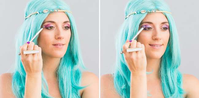2. Нанесите тени цвета фуксии на верхнее веко, растушевав покрытие от внутреннего уголка глаз к внешнему на манер визажа в стиле «кошачий глаз».
