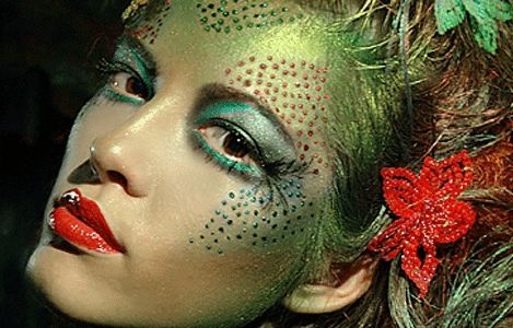 Не всем представительницам прекрасного пола от рождения дана белоснежная кожа. Как быть, если кожные покровы темного оттенка, а быть русалочкой очень хочется? В этом случае следует затонировать всю поверхность лица или основную ее часть в зелено-голубой гамме. Для этого подойдут тени для век необходимого оттенка, рассыпчатые глиттеры и иные декоративные средства, которые сделают лицо «русалочьего» цвета. В качестве украшения можно использовать стразы, пайетки или бусины.