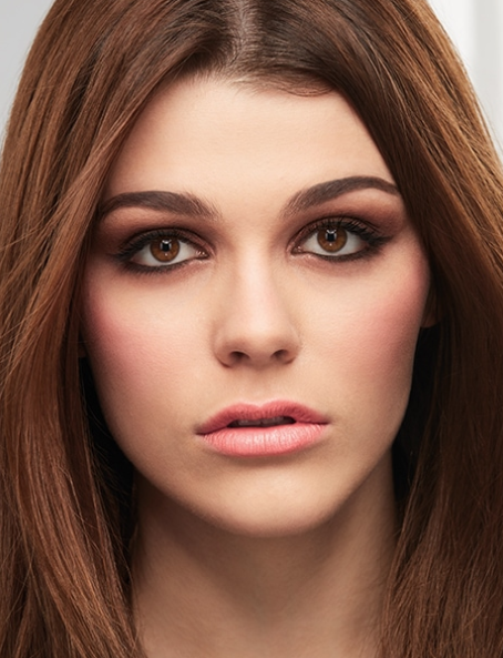 - Чтобы создать скульптурный овал лица, используйте румяна бежевого цвета, чуть темней тона основы кожи. Ресницы должны быть объемными.
