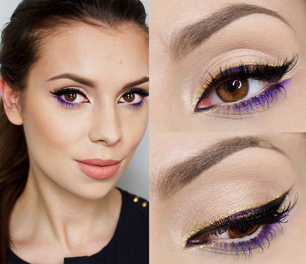 - Нижнее веко подведите золотисто-рыжим оттенком. Можно использовать кайал.