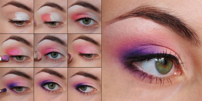 - Светло-розовым оттенком подведите нижнее веко, на верхнее добавьте больше цвета.