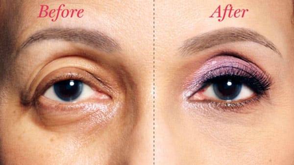 Если нависшее веко полностью перекрывает подвижную часть, то макияж должен оптически скрыть проблему. Мастера используют матовые тени.
