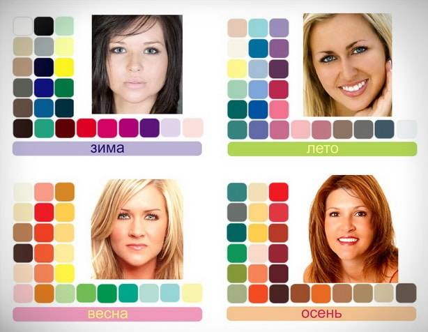 | Весна | Волосы с золотистым отливом, кожа с лёгким оттенком загара. Глаза – светло-голубые, светло-зелёные, светло-ореховые. | Серо-бежевый, желтовато-серый, светлый серо-коричневый |