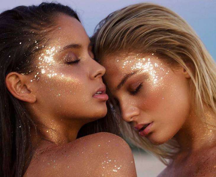 Некоторые ситуации и случаи требуют сияющий с ног до головы образ. Для этого придуманы блестки, которые предназначены для тела. Мелкие декоративные частицы, как правило, и сами сразу неплохо закрепляются на коже, но для длительного эффекта такого образа стоит заранее обработать участки тела праймером или легким кремом.