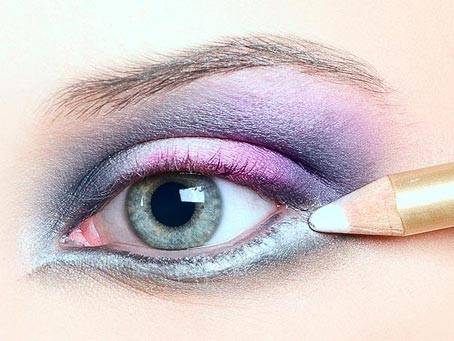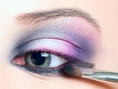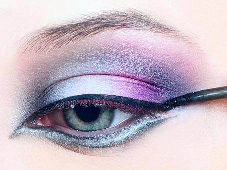 - Более насыщенный фиалковый оттенок теней (лучше выбирать средство с текстурой шиммера) соедините с обводкой контура черным карандашом-кайалом. Смягчите линии таким образом, чтобы создать эффект рассеивания в фиолетовом цвете.