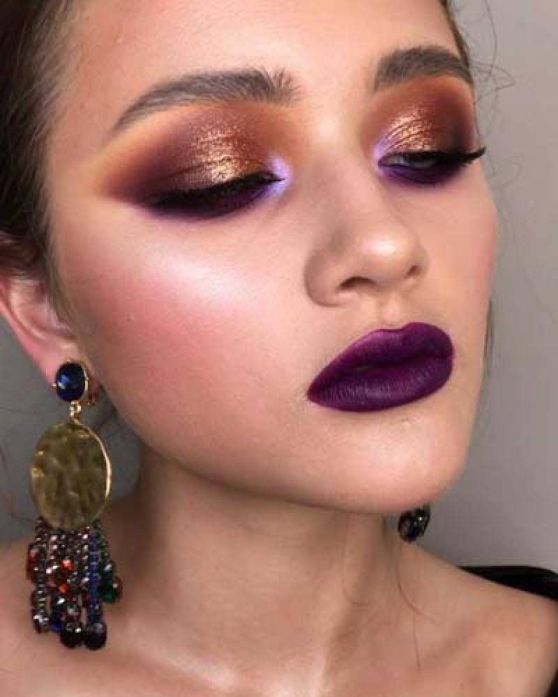 Сочетание темных губ с гламурными веками, покрытыми золотистыми тенями – интересная идея для вечернего выхода.