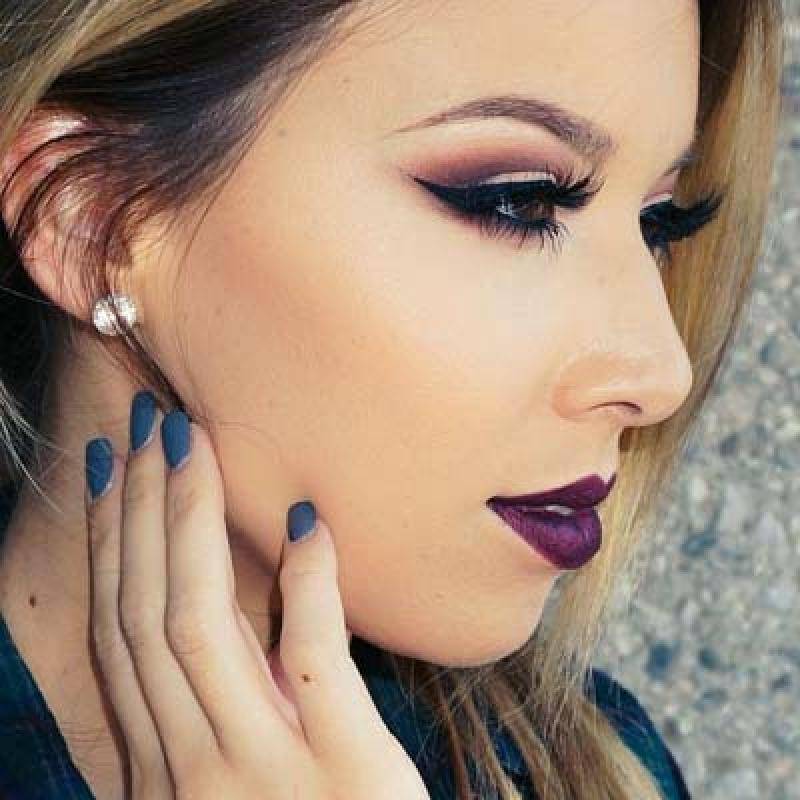 Еще одна красивая идея для вечерних или официальных выходов в свет – это смоки айс с насыщенной темно-фиолетовой губной помадой. Этот цвет на губах похож на классический красный цвет вина.