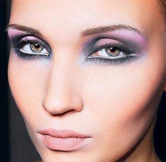 Вечерний «лук» создадут темные и насыщенные краски с перламутром и блеском. Для идеальных карих смоки айз можно взять такие оттенки, как темный индиго, пурпурный или Dark Violet. В качестве светлого тона во внутреннем уголке глаза подойдет перламутровый белый, а накрасить переходные зоны можно аметистовыми, сливовыми или фиолетово-баклажанными тенями. Фото воплощения этой техники можно увидеть даже на модных показах именитых дизайнеров.