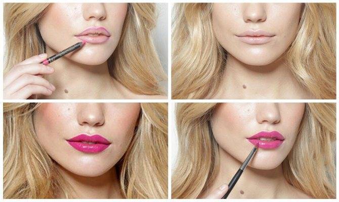 Самый простой способ – выбрать контурный карандаш для губ на пол тона – тон светлее помады. Не наводить им контур, а лишь закрасить небольшой участок посередине губ, а сверху покрыть помадой. Таким образом, середина губ будет светлее, что визуально добавит объем.