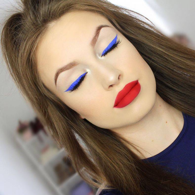Синий цвет уже сам по себе яркий. Сочетать его с броскими тонами помад не стоит, так как весь образ станет вызывающим и безвкусным. Лучше дополнять синий макияж век нейтральными палитрами. Отдавайте предпочтение нюдовым, бежево-розовым, персиково-бежевым тонам.