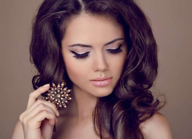 Дополнить этот вечерний вариант помогут оригинально подобранные серьги с камнем, которые подходят для обладательниц карих глаз это: