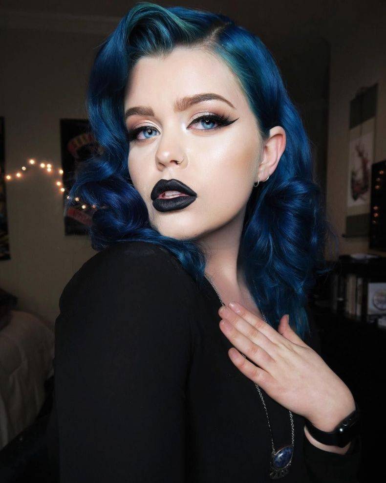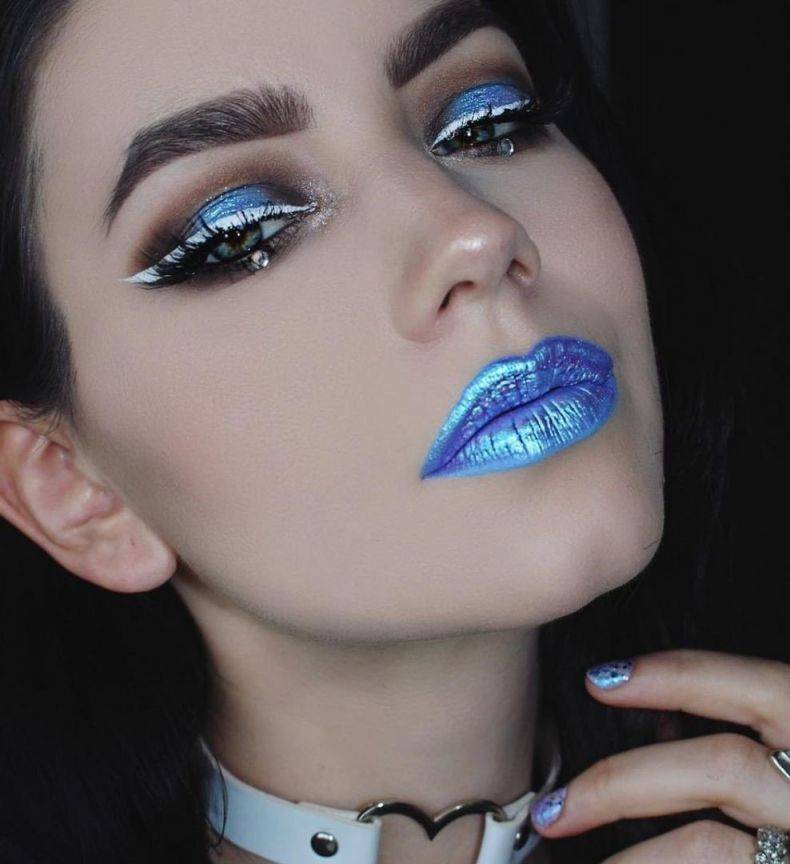 Если вы выбрали помаду, но не знаете, будет ли она сочетаться с синими тенями, то для вас совет: оттенок должен быть приглушенный, не яркий и не темный. Если помада подходит под эти критерии, значит, она будет гармонично дополнять яркий мейкап век. Также можно использовать прозрачные или полупрозрачные блески для губ.