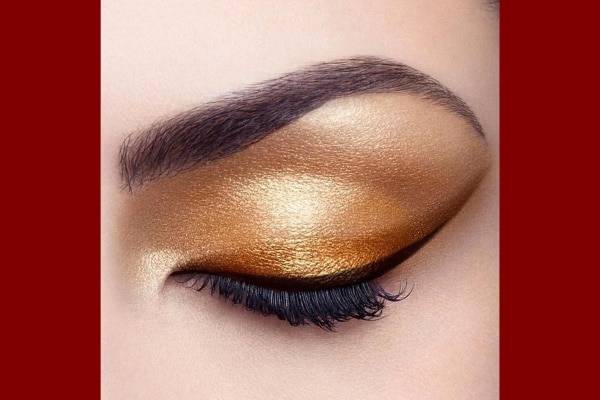 - Золотистыми тенями соедините внутренний угол верхнего века и середину нижнего, где начинаются черные тени;