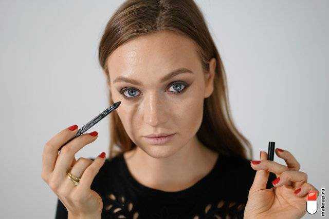 — Теперь приступаем к нанесению подводки: берем черный карандаш и полностью