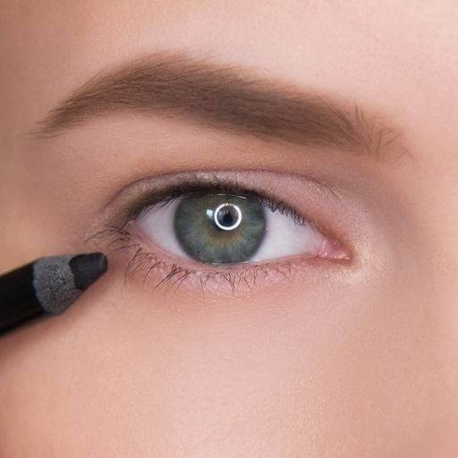 1 В качестве подложки под тени используйте черный кайал. Заштрихуйте с его помощью все подвижное веко, подчеркните линию нижних ресниц и прокрасьте слизистую по всему глазу. Этот трюк поможет сделать макияж глаз более насыщенным.