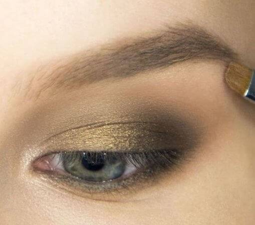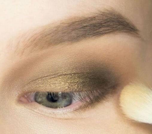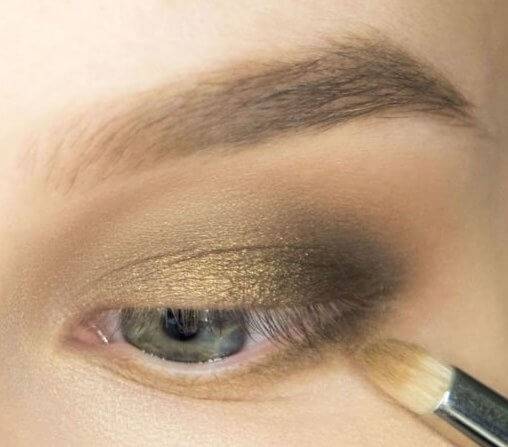 - Возьмите кисточку для макияжа и нанесите самые темные тени на линию, проведенную карандашом. Далее растушуйте границы, чтобы был плавный переход.