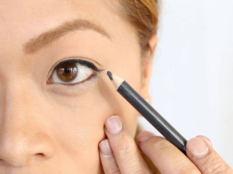 4. Снова используем черный карандаш, наводя уже готовые стрелочки. Можно пройтись и по нижней межресничке, но для узких глаз этот этап не рекомендуется.