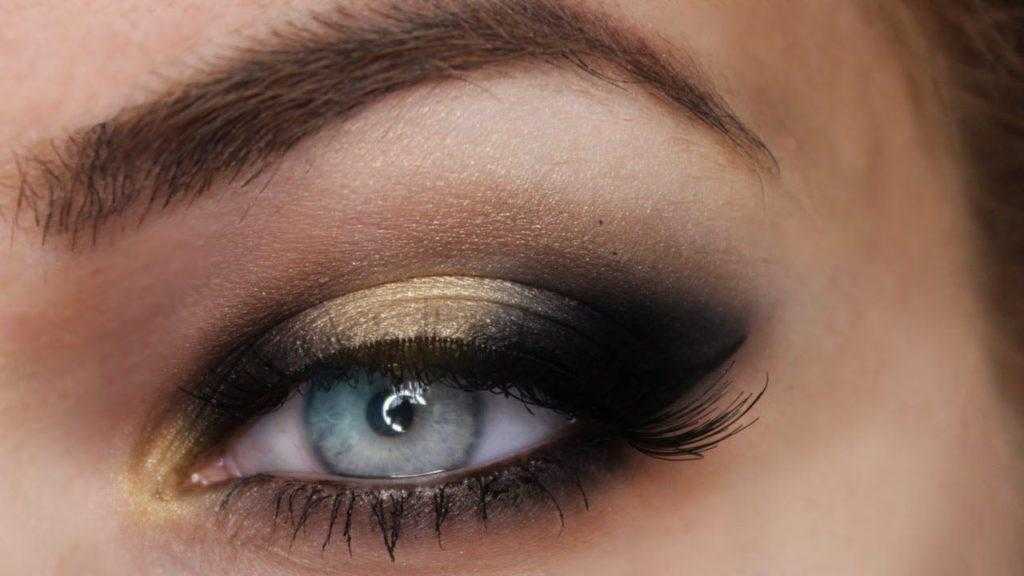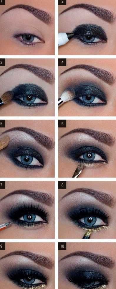 Вечерний макияж smoky открывает голубоглазым модницам много возможностей. Создать глубокий пронзительный взгляд можно с помощью черных, стальных, фиолетовых, угольных оттенков. Для праздничного образа подойдут золотистые и серебристые тени (в умеренном количестве).
