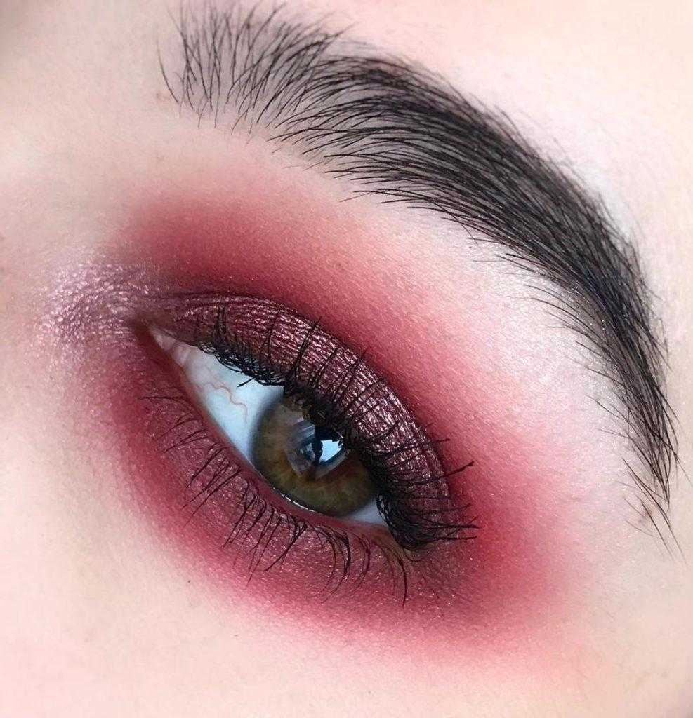 Оттенки красного отлично смотрятся на блондинках и брюнетках. Такой образ подойдёт для любого торжественного события. В качестве подложки можно использовать не тени, а матовую помаду.